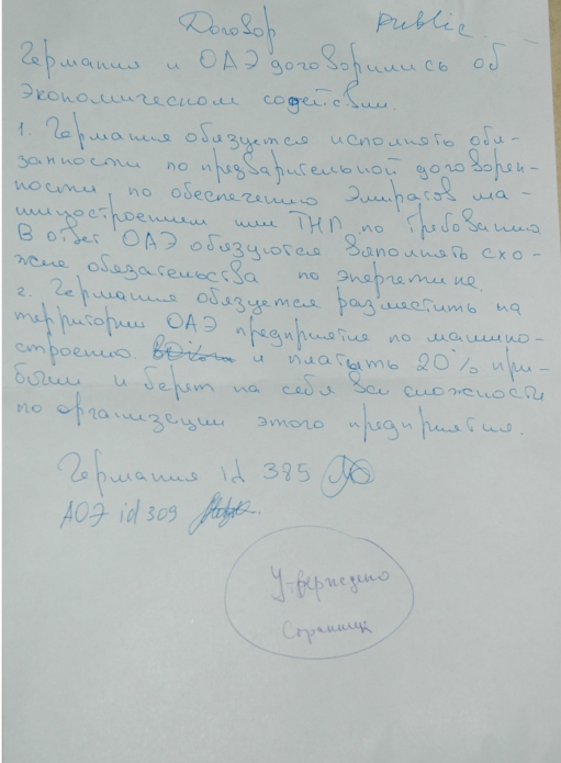 Договор Китай-компания Virgin-ГерманияПосле глубокого обсуждения сложившейся ситуации в мировом сообществе стороны решили начать строительство магистрали Могадишо-Шанхай. Подписано за Virgin Подписано за Германию