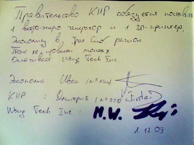 Договор Экополис - КНР - Wong Tech Inc.Правительство КНР обязуется: 1) поставить 1 ветрогенератор и 1 3d-принтер Экополису в Урало-Сибирский регион. 2) Провести монтажные работы. Компания Wong Tech Inc. обязуется оплатить поставку и монтаж оборудования в полном объёме. Подписи трех сторон присутствуют.